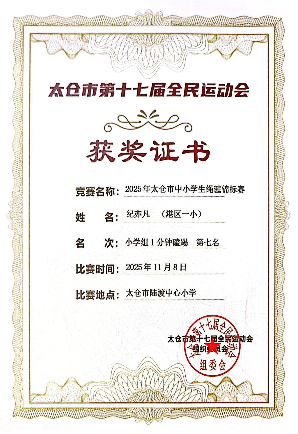 2025.11 纪亦凡获2025太仓市中小学绳毽锦标赛小学组1分钟磕踢第七名