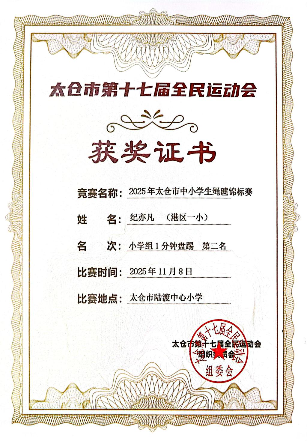 2025.11 纪亦凡获2025太仓市中小学绳毽锦标赛小学组1分钟磕踢第七名