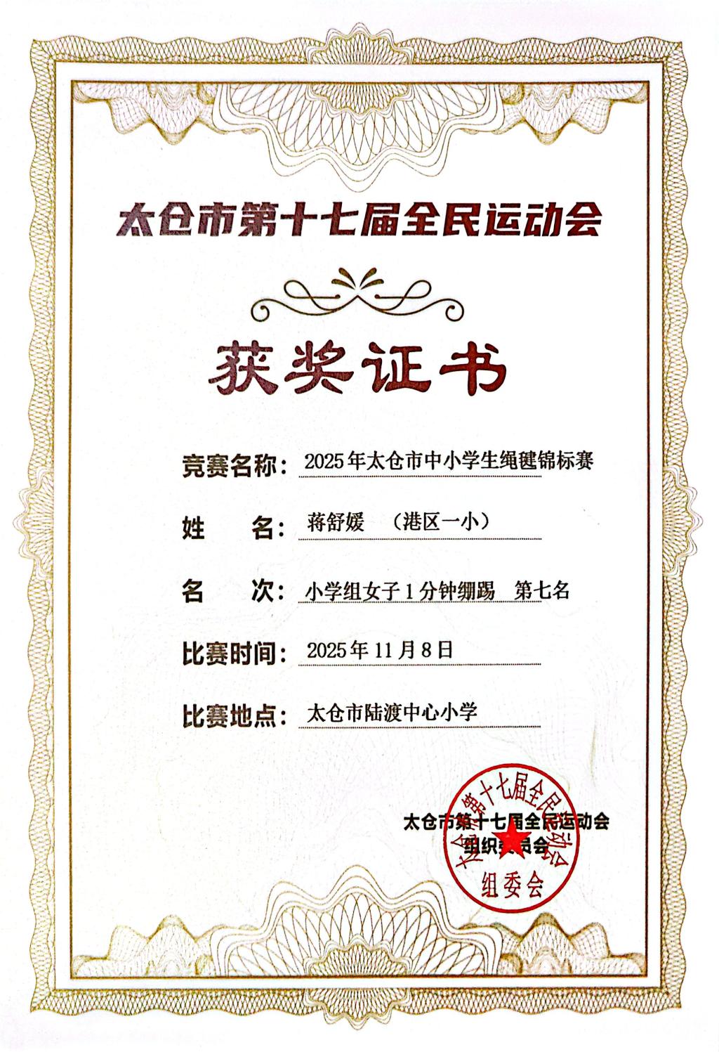 2025.11 蒋舒媛获2025太仓市中小学绳毽锦标赛小学组1分钟盘踢第七名