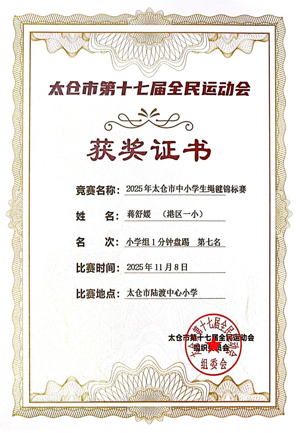 2025.11 蒋舒媛获2025太仓市中小学绳毽锦标赛小学组1分钟盘踢第七名