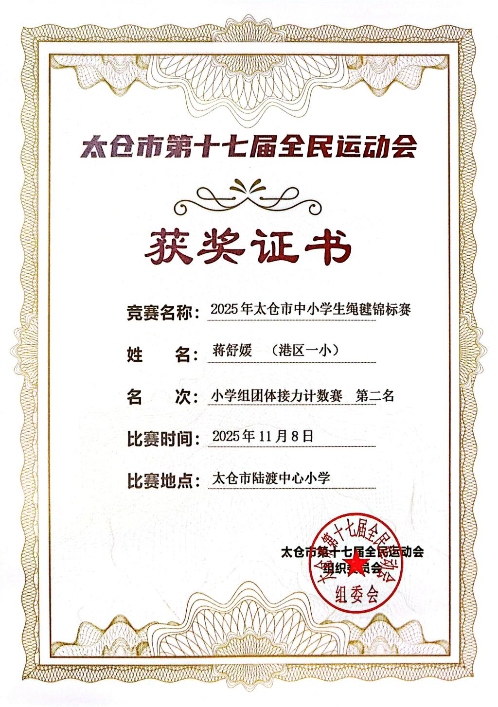 2025.11 蒋舒媛获2025太仓市中小学绳毽锦标赛小学组团体接力计数赛第二名