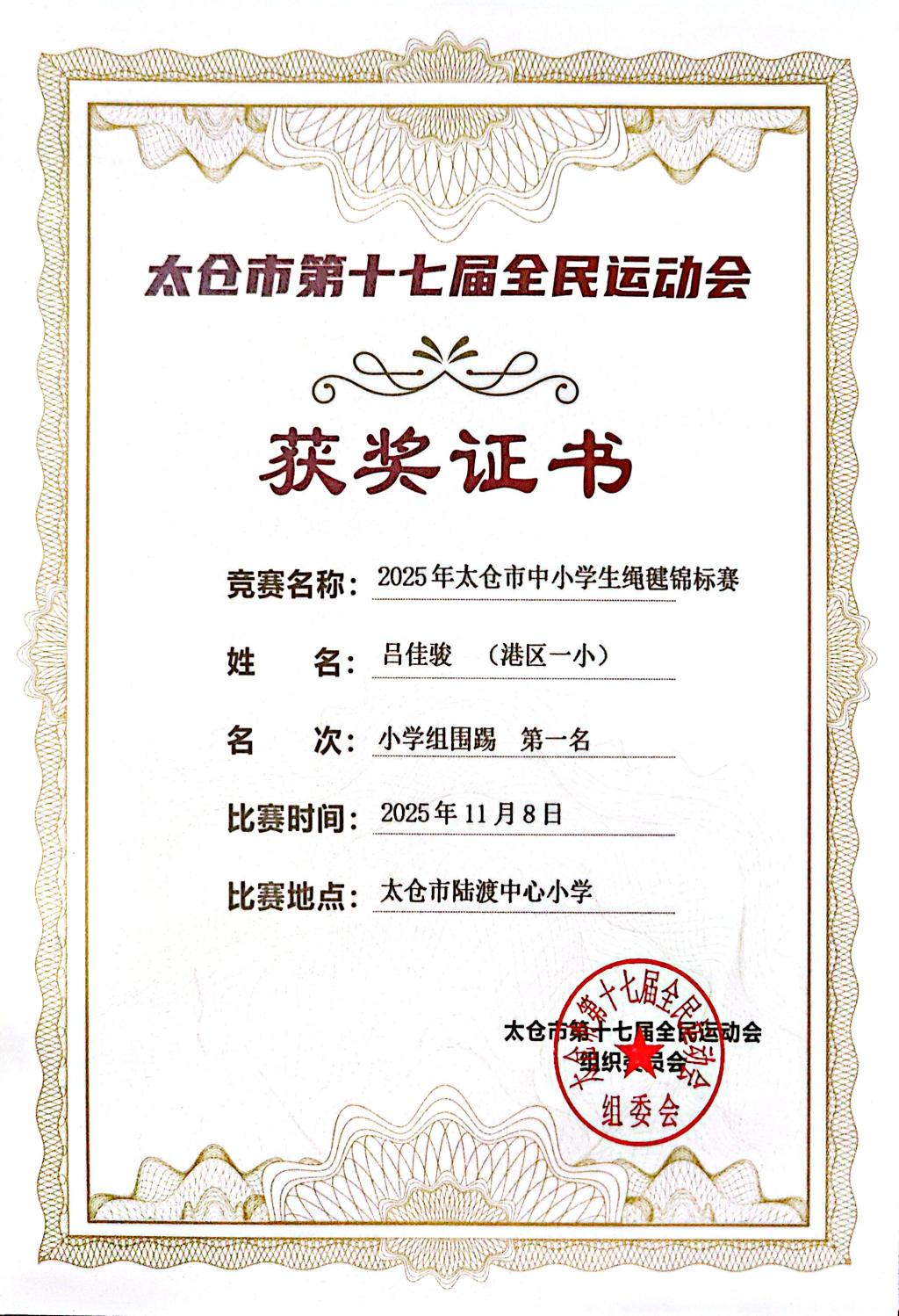 2025.11 吕佳骏获2025太仓市中小学绳毽锦标赛小学组围踢第一名