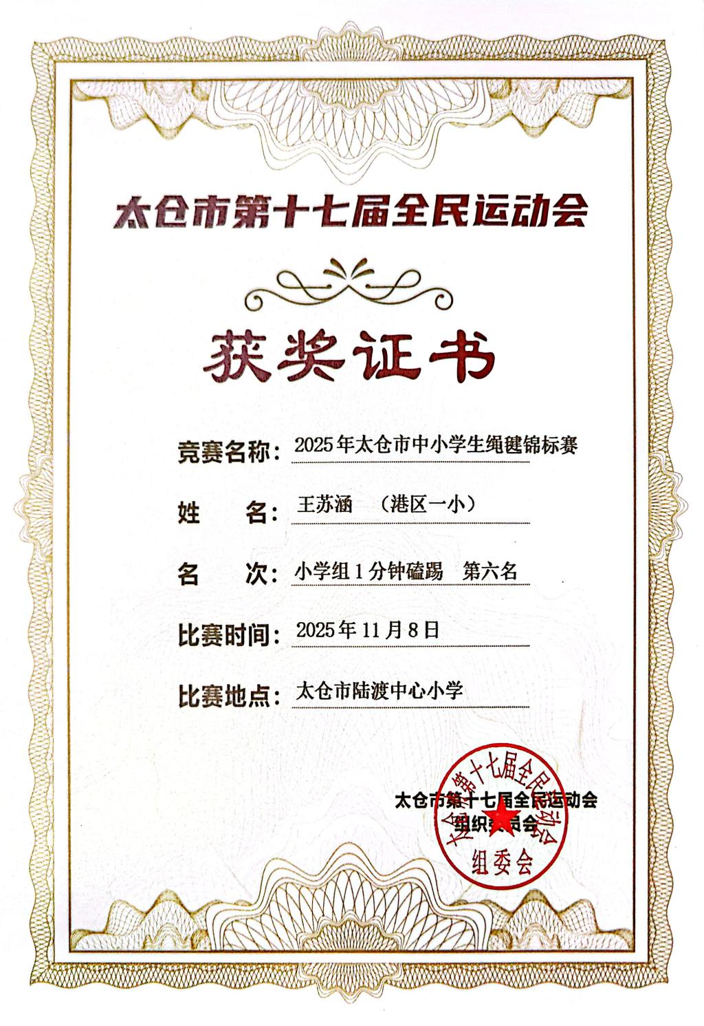 2025.11 王苏涵获2025太仓市中小学绳毽锦标赛小学组1分钟磕踢第六名