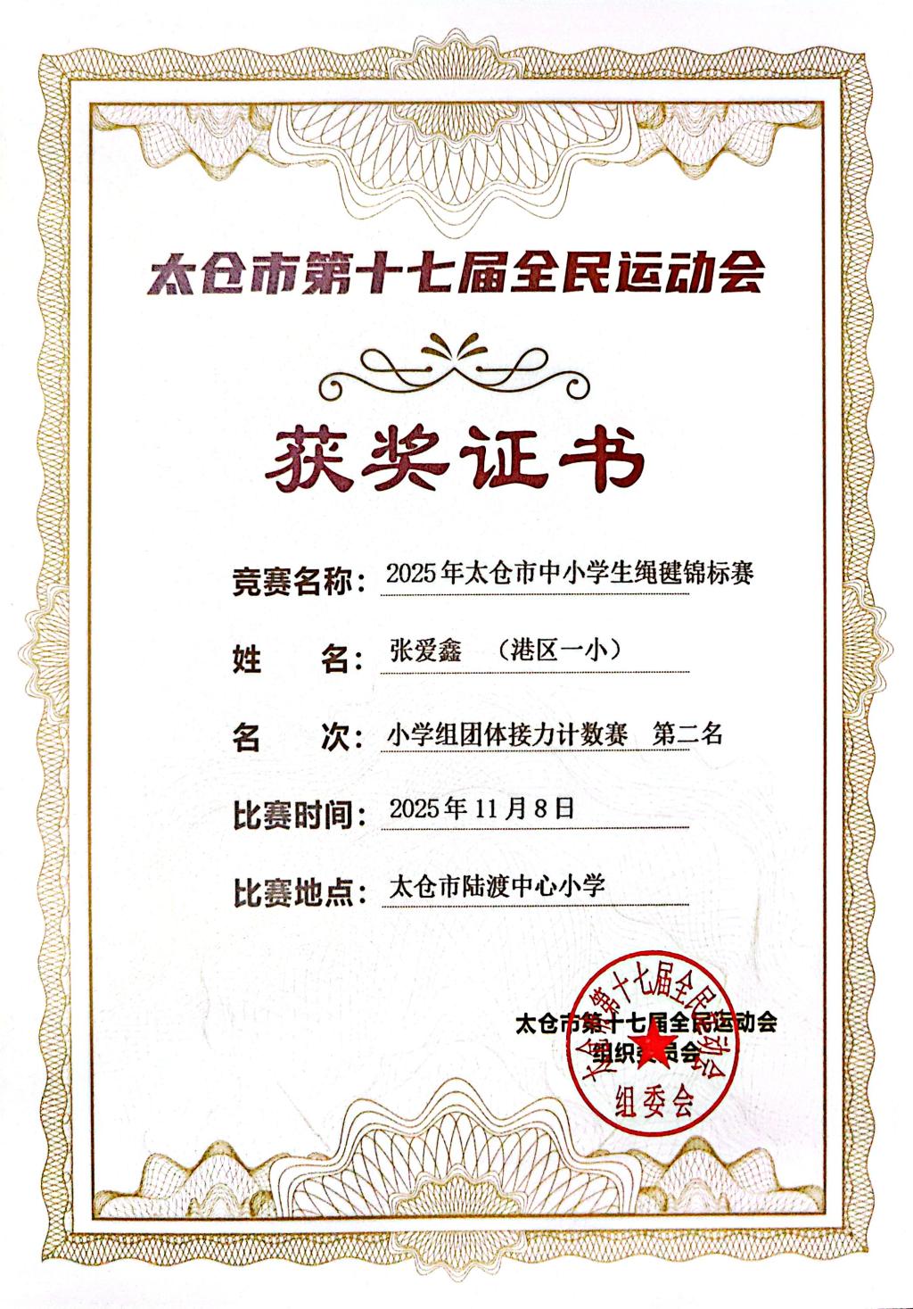 2025.11 张爱鑫获2025太仓市中小学绳毽锦标赛小学组团体接力计数赛第二名
