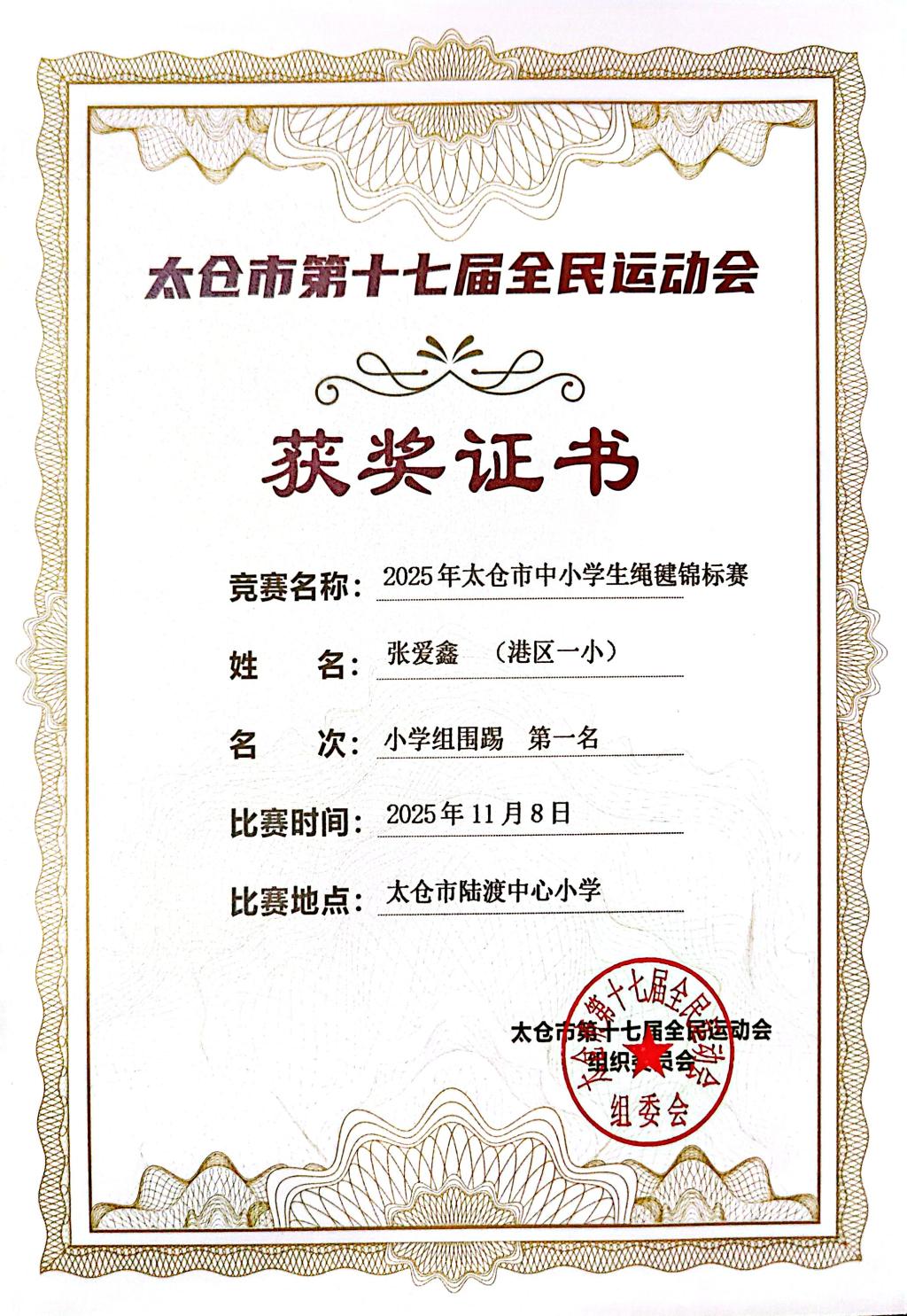 2025.11 张爱鑫获2025太仓市中小学绳毽锦标赛小学组围踢第一名
