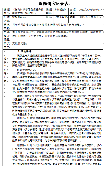 2025年9月研讨活动:《指向科学学习品质提升的教师支持行为研究》课题研究记录表
